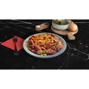 Cerdo salteado ,salchicha ,maiz tierno ,cebolla larga ,plátano maduro ,soya hondashi.